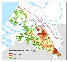 Modelonzekerheid top Formatie van Stramproy, eerste kleiige eenheid (SYk1), uitgedrukt als standaarddeviatie (m). De boorlocaties waarin de eenheid is aangetroffen zijn als groene punten weergegeven.