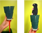 Plak de mol met plakband op het rietje. Steek het rietje door het gaatje in de beker. Klaar is je stokpop!